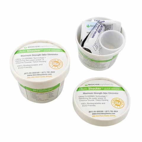 Biocide Systems is proud to introduce their Bio-Shocker line of Chlorine Dioxide odor eliminating products. These products exclusively use the revolutionary ClO2-DMG Technology that delivers the super odor eliminating power of Chlorine Dioxide, also known as ClO2. Whether you are dealing with cigarette, pet, vomit, urine, rotten food, mold, mildew, fish, skunk odor, and any other odor type you can think of, this line of products will get rid of the foul odor permanently. The secret lies in the fact that the ClO2 is a gas that can penetrate deeper and more effectively than other non-gas products. ClO2 molecules are attracted to the negatively charged odor molecules like a magnet is to iron. So it literally seeks them out and eliminates them. To top it all off, the Bio-Shocker product line is non-toxic, 100 percent biodegradable, does not leave any carbon footprint and is 100 percent made in the USA.