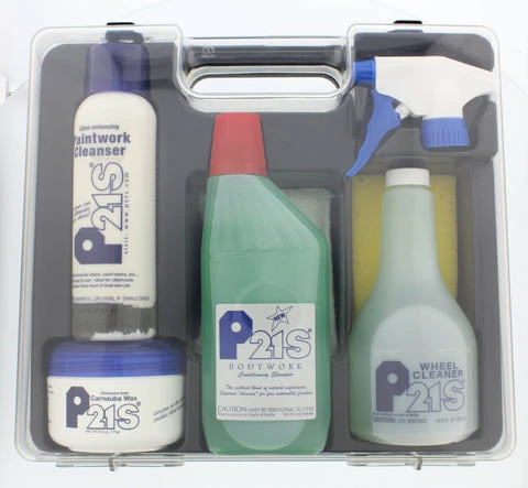 - Auto care set combines P21S wheel cleaner, car soap, paint cleanser, and wax