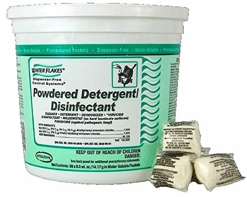 - Water Flakes Detergent/Disinfectant is premeasured in individual packets that dissolve in water